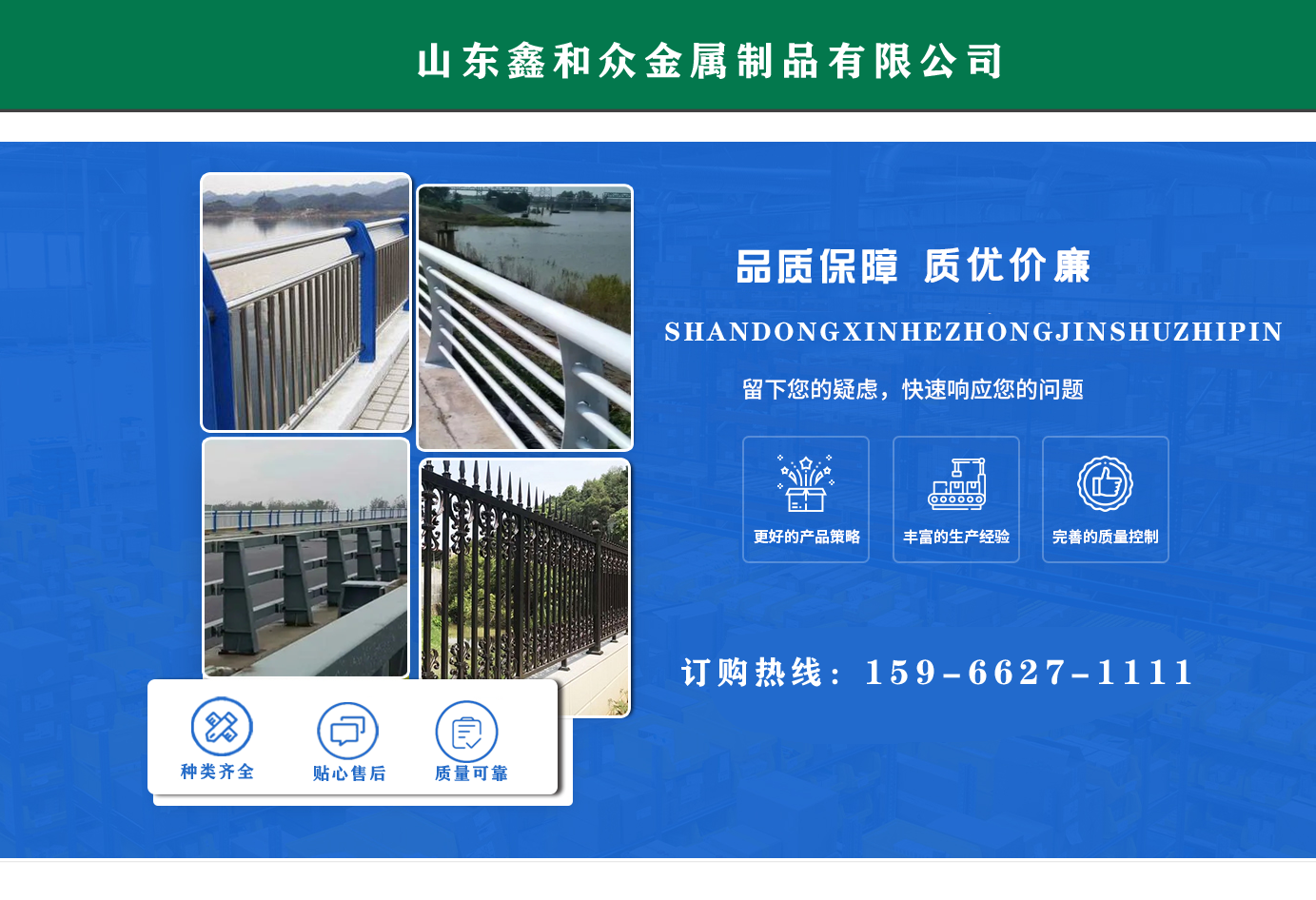 山東鑫和眾金屬制品有限公司主要產(chǎn)品有防撞護欄,橋梁護欄,道路護欄,河道護欄,不銹鋼護欄等護欄。提供設計方案,一站式定制,包您滿意價格優(yōu)惠,歡迎來電咨詢! 公司常年從事銷售護欄防撞護欄,橋梁護欄,道路護欄,河道護欄,不銹鋼護欄,橋梁鋼護欄,河道燈光護欄等。產(chǎn)品廣泛應用于橋梁、河道、旅游景區(qū)、道路、公路、公園、小區(qū)、景觀、道路防撞等領域?! 」井a(chǎn)品均采用優(yōu)質(zhì)不銹鋼材料,符合相關標準。各種型號不銹鋼復合管及護欄,質(zhì)量嚴格把控。產(chǎn)品強度高、耐腐蝕、焊接牢固、抗沖擊、性能好,防撞護欄結構簡單、美觀實用大方?! g迎前來訂購!...